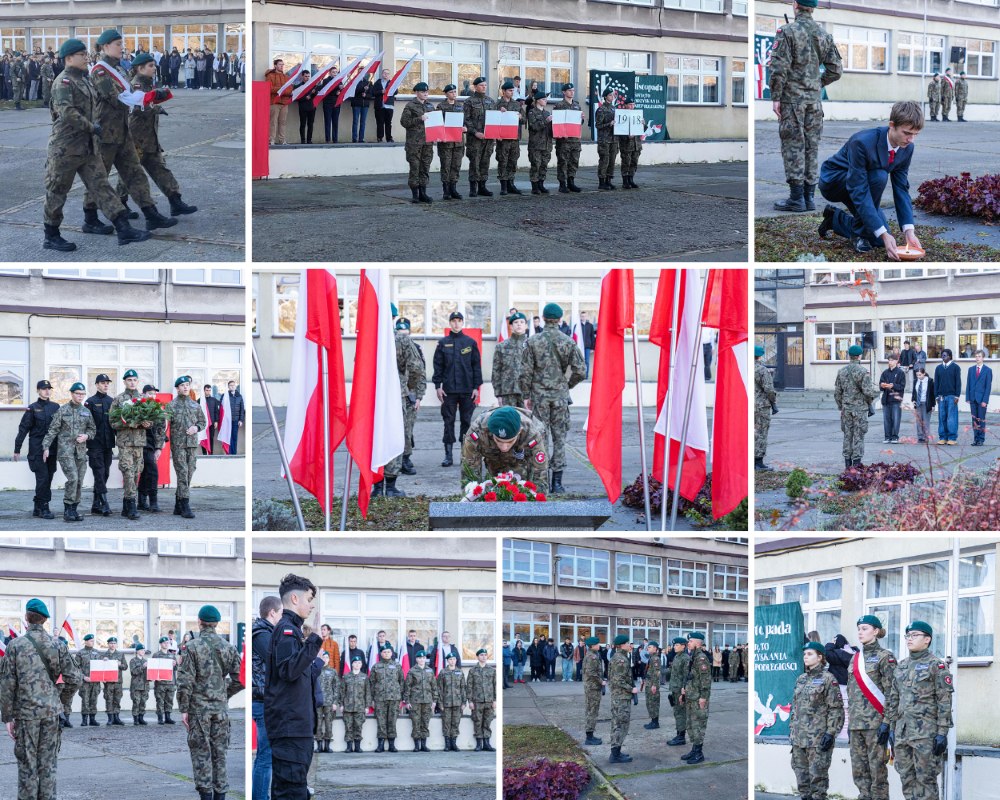 W trakcie uroczystości uczniowie klas mundurowych pełnili honorową wartę oraz złożyli kwiaty pod tablicą pamiątkową, oddając hołd bohaterom walczącym o niepodległość Polski. Następnie delegacja uczniów klas pierwszych zapaliła znicze, symbolicznie upamiętniając tych, którzy poświęcili swoje życie w imię wolności Ojczyzny. Doniosłym momentem akademii było również ślubowanie uczniów klas pierwszych, którzy zostali oficjalnie przyjęci do społeczności szkolnej. Dziś to my piszemy kolejne karty historii, żyjąc w wolnym i demokratycznym kraju, w którym patriotyzm, odpowiedzialność i pamięć o przeszłości stanowią fundament naszej tożsamości. Przed młodym pokoleniem stoją nowe wyzwania, które podejmą, budując lepszą przyszłość dla siebie i całego kraju. Akademię przygotowały panie Barbara Jakubek, Dorota Śliwa i Eliza Świniarska we współpracy z uczniami klas mundurowych i technikum.
