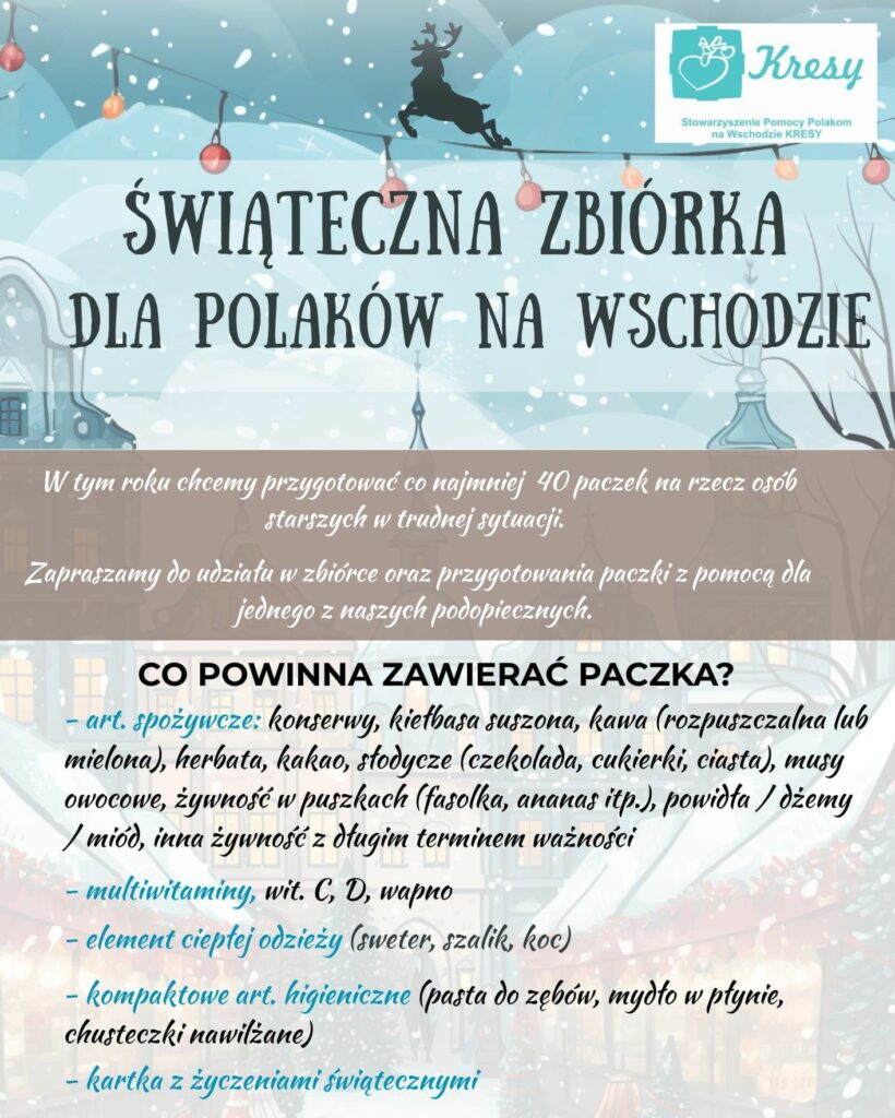 Zapraszamy do wzięcia udziału w kolejnej edycji akcji Stowarzyszenia Pomocy Polakom na Wschodzie „KRESY”. Koordynatorką zbiórki w Zespole Szkół Zawodowych Huty im. T. Sendzimira jest Wiktoria Mizia. W tym roku akcja skoncentrowana jest na pomocy osobom starszym zamieszkałym w Ukrainie, w takich miastach jak Lwów, Drohobycz, Tarnopol czy Zbaraż. Odbiorcami paczek będą rodowici Polacy w podeszłym wieku (70-90 lat), cierpiący na różne choroby wymagający stałego kupowania leków. Stowarzyszenie planuje wysłać przed Świętami Bożego Narodzenia paczki dla 30-40 osób, co wymaga zebrania ok. 300 kg darów.