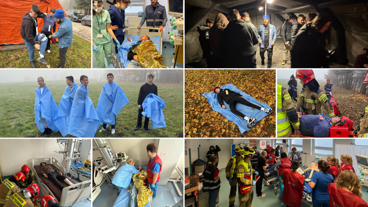 Uczniowie wcielili się w role pozorantów, odgrywając osoby poszkodowane w pozorowanym wypadku śmigłowa. Każdy z uczestników miał przydzieloną konkretną rolę oraz rodzaj obrażeń, które zostały realistycznie odwzorowane dzięki profesjonalnej charakteryzacji medycznej. Pozoranci zostali wcześniej przygotowani do swoich zadań, poznając podstawowe zasady zachowania w trakcie akcji ratowniczej. Podczas ćwiczeń strażacy z PSP prowadzili działania zgodnie z procedurami ratownictwa medycznego – zabezpieczali miejsce zdarzenia, ewakuowali poszkodowanych, udzielali im pierwszej pomocy oraz przekazywali do dalszej opieki medycznej. Po zakończeniu symulacji część uczniów – zgodnie ze scenariuszem – została przetransportowana na Szpitalny Oddział Ratunkowy (SOR), gdzie kontynuowano działania w ramach realistycznego scenariusza ćwiczeń.