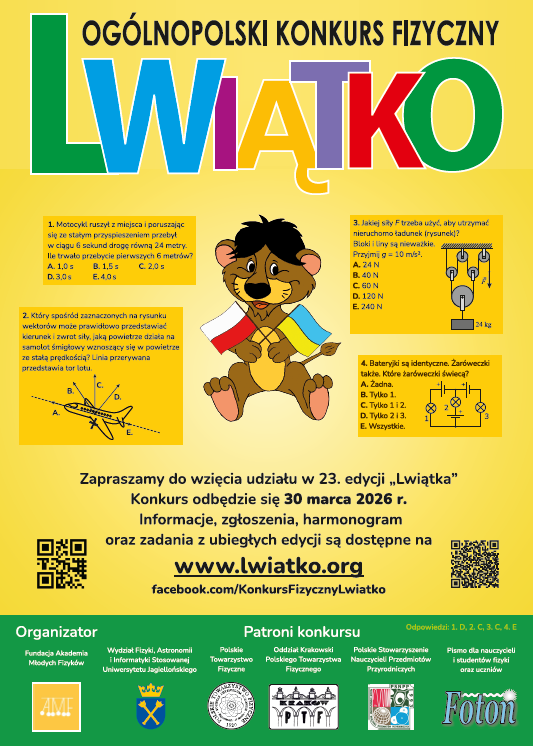 Serdecznie zapraszamy do udziału w Ogólnopolskim Konkursie Fizycznym „Lwiątko”. Każdy może zmierzyć się z zadaniami na poziomie danej klasy. Chętnych zapraszamy do zgłaszania udziału u p. Marty Ciepieli s.303. Serdecznie zapraszamy!. Zadania z lat ubiegłych oraz informacje o konkursie na stronie https://lwiatko.org/.