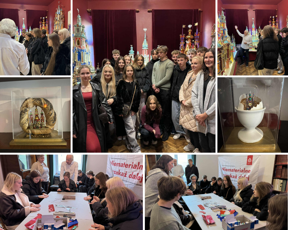 W dniu 2 października 2025 roku, uczniowie klasy 3LC mieli okazję wziąć udział w wyjątkowych warsztatach poświęconych tradycjom i zwyczajom Krakowa, prowadzonych przez znanych twórców i pasjonatów kultury krakowskiej – Renatę i Marka Markowskich. Spotkanie było fascynującą podróżą do świata szopki krakowskiej – unikalnego fenomenu wpisanego na listę niematerialnego dziedzictwa kulturowego UNESCO. Uczniowie nie tylko poznali historię tego niezwykłego rękodzieła, ale również mieli okazję przyjrzeć się z bliska procesowi jego tworzenia. Opowieści prowadzących, pełne pasji i miłości do Krakowa, ukazały szopkę jako nie tylko dzieło sztuki, ale i nośnik tradycji, pamięci oraz lokalnej tożsamości. W czasie warsztatów panowała ciepła, twórcza atmosfera – sprzyjająca zarówno nauce, jak i refleksji nad pięknem dziedzictwa kulturowego naszego miasta. Dziękujemy pani Renacie i panu Markowi Markowskim za inspirujące spotkanie, które z pewnością na długo pozostanie w pamięci uczestników.