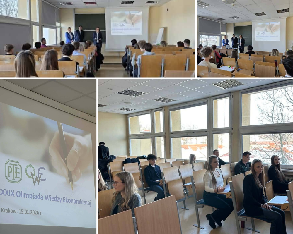15 stycznia 2026 r. w Krakowie odbyły się zawody II stopnia (okręgowe) XXXIX Olimpiada Wiedzy Ekonomicznej. Uczniowie z naszej szkoły, którzy wcześniej zakwalifikowali się na ten etap, zmierzyli się z wymagającymi zadaniami sprawdzającymi zaawansowaną wiedzę z zakresu ekonomii, finansów oraz zagadnień społeczno-gospodarczych. Atmosfera skupienia i powagi na sali podkreślała rangę wydarzenia, które stanowi istotny krok na drodze do etapu centralnego oraz cenne doświadczenie edukacyjne dla ambitnych młodych ekonomistów.