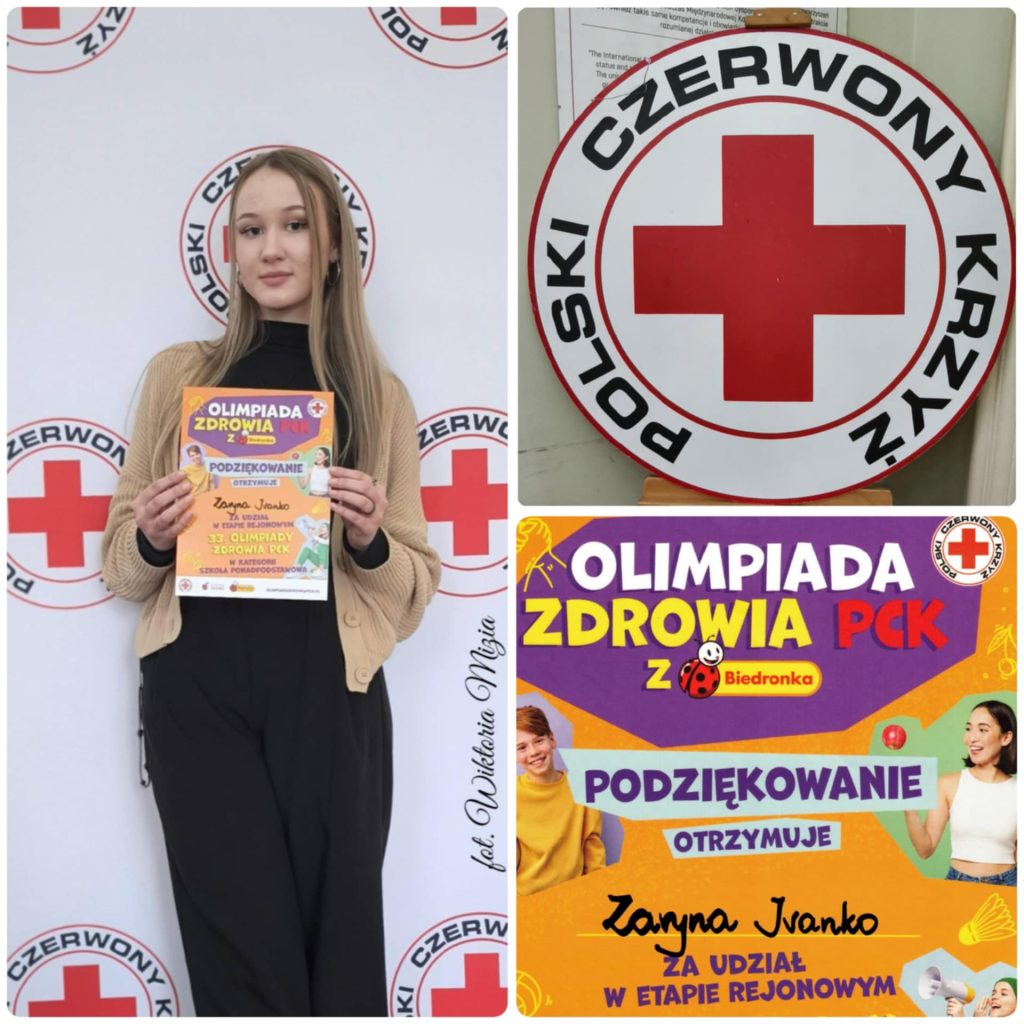 Z radością informujemy, że uczennica Zaryna Ivanko pomyślnie przeszła etap szkolny i 14.01.2026 r. wzięła udział w etapie rejonowym XXXIII Olimpiady Polskiego Czerwonego Krzyża, której celem jest kształtowanie wśród dzieci i młodzieży potrzeby dbania o własne zdrowie oraz środowisko naturalne, a także promowanie dobrego zdrowia i wysokiej jakości życia. Konkurs daje uczestnikom możliwość wykazania się wiedzą na temat szeroko rozumianego zdrowego stylu życia oraz zachęca do podejmowania modelowych działań na rzecz lokalnej społeczności.